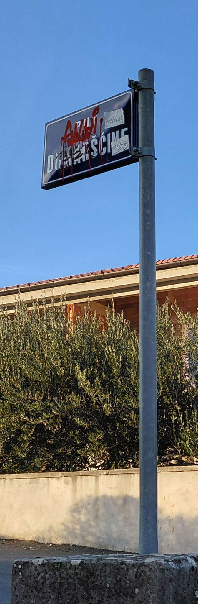 Znak je vandaliziran te tako stoji mjesecima! Natpis je pogotovo nečitljiv kad se gleda s južne strane!